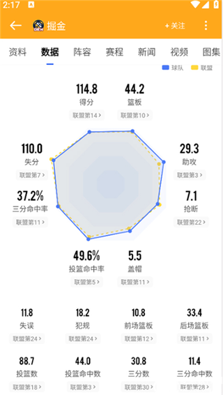 2、比如我想看看最近状态正佳的掘金队,点击即可查看,球队得分、篮板、助攻等数据,以及排名联盟第几。
