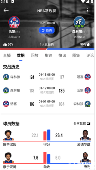 4、从对比数据中我们可以看到两支球队的交战历史,以及球员数据
