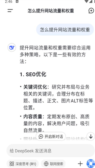 2、进入主界面后,大家可以在对话框内输入自己想要询问的内容,比如,我想问下“怎么提升网站流量和权重”