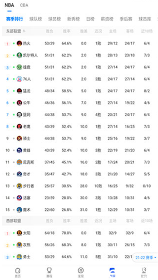3、大家可以实时查询自己喜欢的球队或者球员数据,排名,记录,得分,技术统计分析掌握在您的手中。