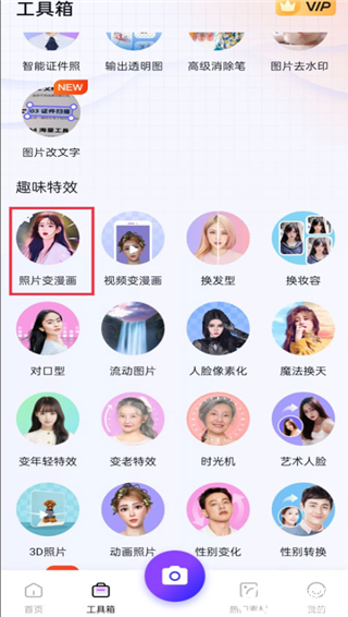 2、想要打造漫画效果,向下滑动找到【趣味特效】,点击【照片变漫画】