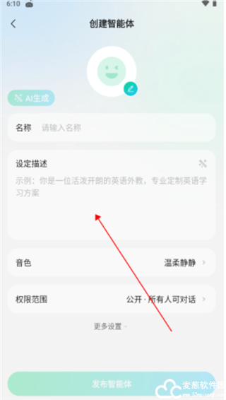 3、输入名称、设定 描述、音色等基础属性,打造你的AI陪伴助手,有什么问题都可以进行询问。