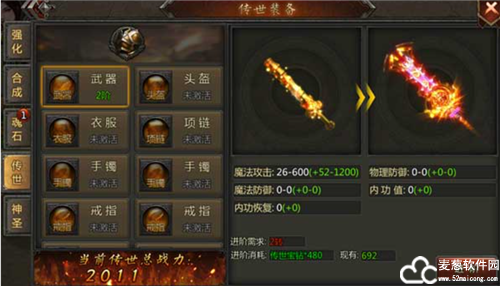 激活传世装备并消耗材料进阶,可获得大量属性与强力技能 。角色70级时开启