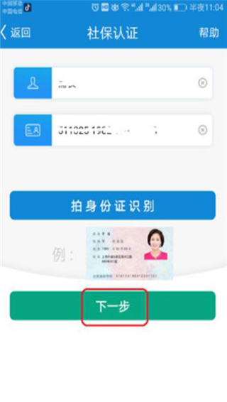 3、大家需要输入自己的身份证号码和名字,当然也可以直接拍摄身份证快速识别。
