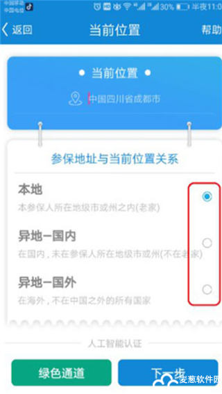 4、填写你的当前位置,并且选择参保地址与当前位置关系。