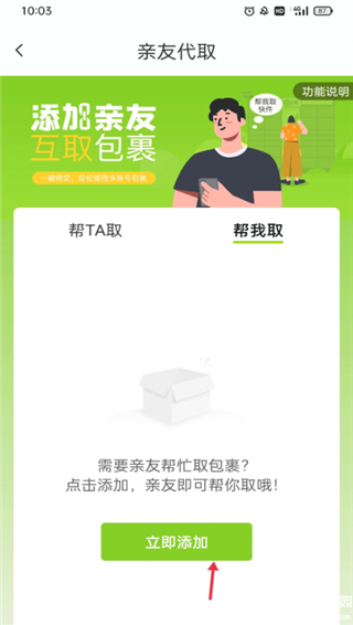 2、用户需要添加亲友的联系方式后,方可让亲友代取你的包裹。