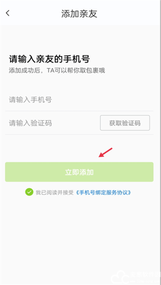 3、大家需要输入亲友的手机号,然后获取验证码即可添加成功。