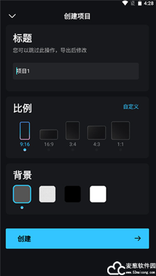 3、点击【创造】可以打造你的视频,先设计一个标题、比例以及背景,当然你也可以编辑完成后进行修改。