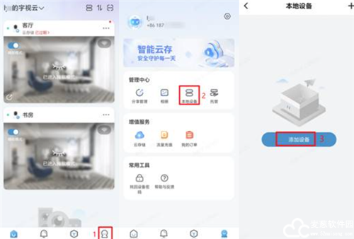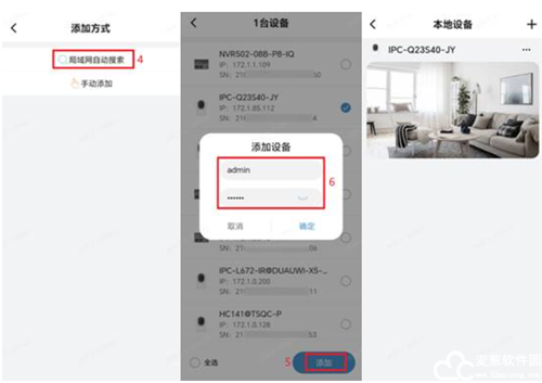 2、登录账号后,进入【我的】-【本地设备】-【添加设备】界面,点击“局域网自动搜索”,选中需要添加的设备,点击“添加”,输入设备用户名和密码,即可添加在线,观看实况。