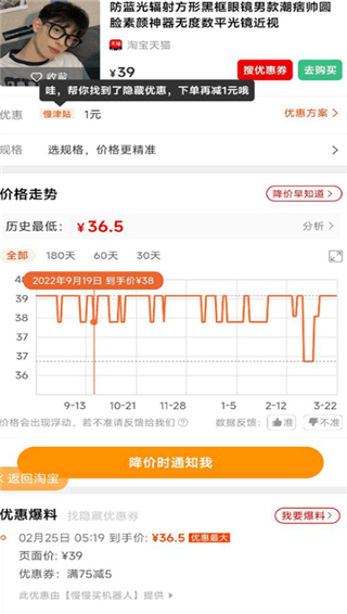 3、查询商品的历史价格,下方会有一个价格走势表可以让你知道曾经最低价到了多少,还有优惠爆料下次折扣时间,我们点击上方的搜优惠卷。