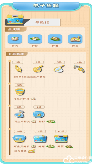 渔线-放线器-渔网-鱼竿-渔桶(可生产鲜贝)-鱼袋(可生产鲜贝与鲜虾)-小鱼缸-鱼缸(可生产鲜贝、鲜虾、鲜蟹)-鱼箱-电子鱼箱(可生产鲜贝、鲜虾、鲜蟹、鲜鱼)满级10级