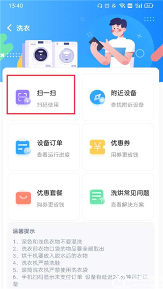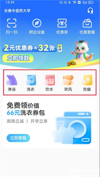 2、首页提供多种服务给大家,淋浴、洗衣、饮水、吹风等,大家按需选择。
