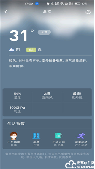 3、对于当天的空气质量会给大家一些建议,比如是否需要佩戴口罩、开窗、开启空气净化器等。