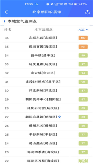 4、还能通过本地空气监测点,查看到各个区域的AQI指数。