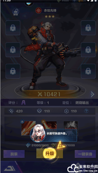 4、点击英雄界面的【升级】,长按可快速升级。