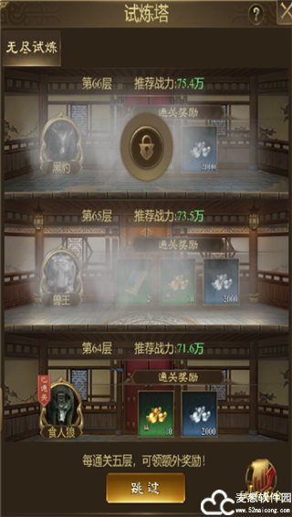 点击“挑战”即可进入对应层数,若战力明显高于当前层数推荐战力,则会出现“跳过”按钮,点击后可直接跳过所有满足条件的楼层,并领取奖励。
