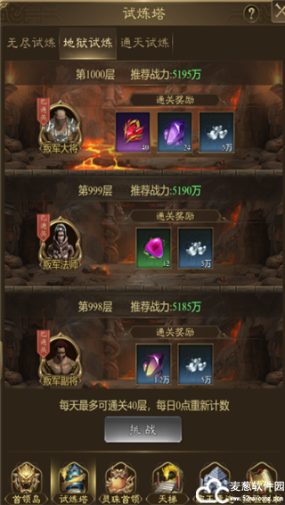 地狱试炼每日最多通关40层,可获取银子、坐骑丹、披风丹、强化石、觉醒灵石、坐骑装备石等奖励。