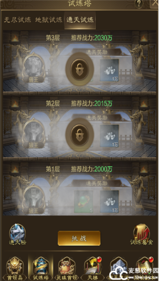 试炼塔分为无尽试炼、地狱试炼以及通天试炼,可在“征战”的“挑战”页面进入;