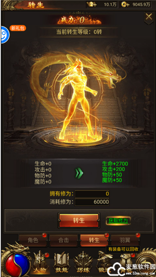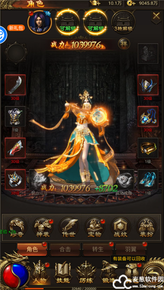 角色件装备工11件,基础装备8件和2个特戒和一个官印。系统功能包含特戒、神装、传世、宝物、装扮、战纹、角色,合击,转生,羽翼;