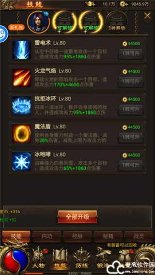 人物职业技能、内功、经脉、秘籍四个玩法;
