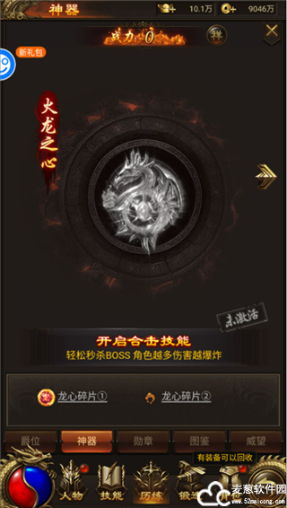 宝物系统:人物等级达到45级开启,包含两种玩法:龙魂、魂骨;