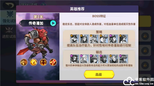 强化试炼的boss为传奇潘加,该boss可以稳定反击,技能对全体敌人造成伤害,对低血量单位造成毁灭性伤害。对战策略:提高队伍治疗能力,针对性地对传奇潘加进行控制我方输出:强大的单体输出以及偷取攻击的能力可以更加轻松的战胜传奇潘加。
