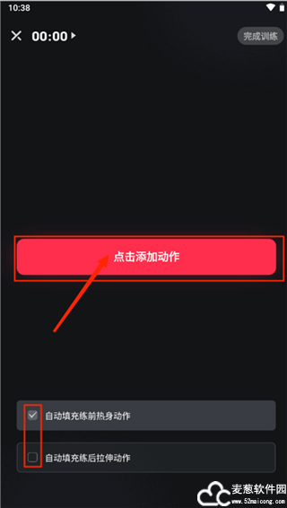 2、点击添加动作,如果想要先热身的朋友们也可以点击下面自动填充练前热身动作以及练后拉伸动作。