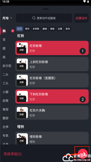3、针对不同的部位,比如我想练胸,由杠铃卧推、杠铃片夹胸等,想要哪个动作添加即可。