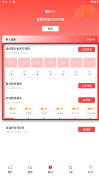 3、特别打造的福利中心,每天签到都可以领取红包,每天追剧完成任务也能领红包。