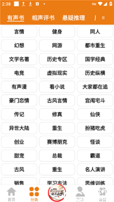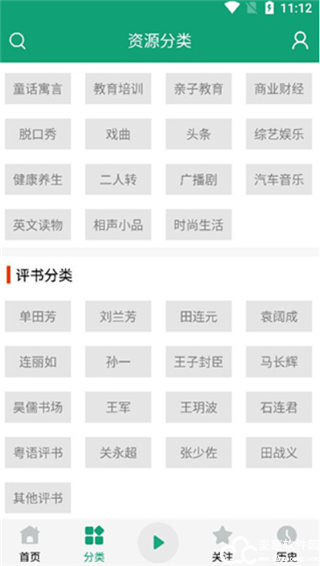 2、资源分类板块非常齐全,像童话寓言、脱口秀、健康养生等以及很多的评书。