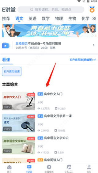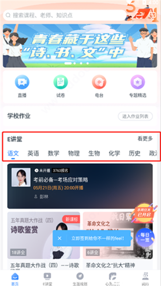 2、首页推荐板块,有个E讲堂内有着语文、英语、数学、物理等各项科目。