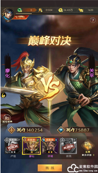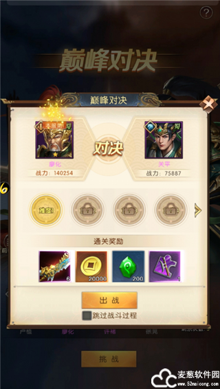 2、每个武将都可以选择不同难度的关卡来进行对决,但每次只能挑战一个关卡,每个武将都有25个难度关卡难度越高,获得的奖励越丰富,即便没有玩家所需要的武将神器碎片,也可以挑战获取强化材料陨铁,以及对应资质的武将神器碎片。