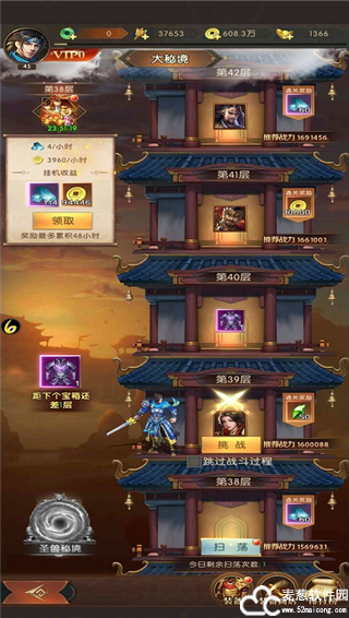 大秘境这个副本的主体是一座不断向上的高塔,主公需要选择最强的一队武将前往挑战,层数越高,关卡难度越大,60层前每过10层,可获得一件紫色品质的装备奖励,60层之后每20层获得装备或者相关道具