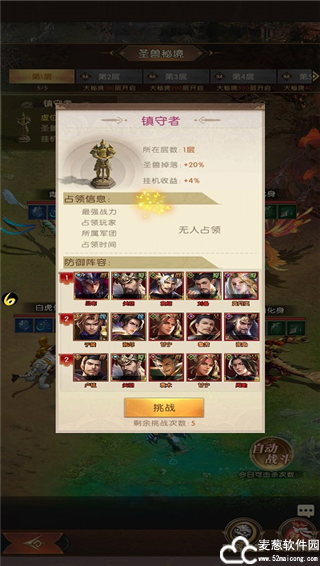 击杀圣兽不是必定获取首饰装备,主公可以通过击败镇守者来增加掉落几率,但需要三只队伍都通过才算击败镇守者,击败镇守者之后还能提升大秘境的挂机收益,所在的圣兽秘境层数越高,提供的收益比例也就越高。