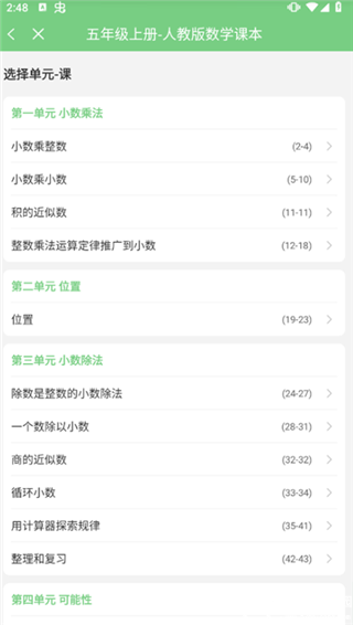 2、比如我们选中五年级上册人教版数学课本,然后选择单元。