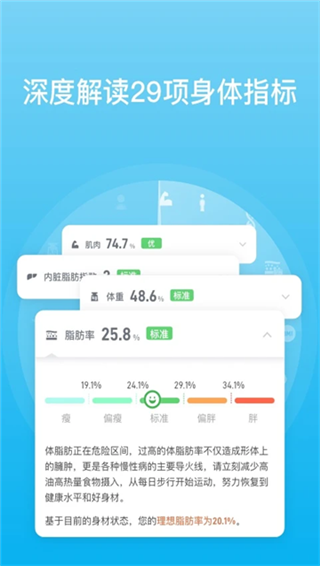 1、可即刻同步体重、脂肪率、内脏脂肪指数等29项重要体征指标,看看自己哪一项需要控制一下;