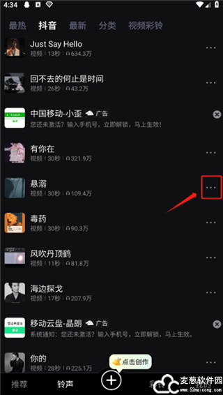 2、在【铃声】板块里有很多抖音精选,都是十分好听的歌曲,大家可以任意选择,点击后面的三点。