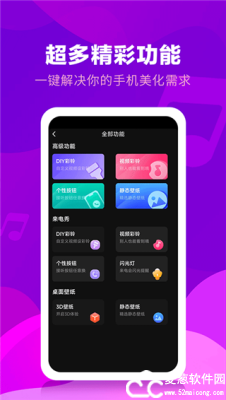 操作简单,设置便捷,大家点击一键即可完成。视频铃声、手机铃声、来电秀、联系人专属来电秀、微信壁纸、QQ皮肤、手机高清动态壁纸,统统都可以搞定!