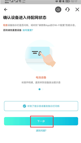 3、大家需要确认设备进入待配网状态,长按开机键,直到听到新设备发出提示音。