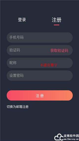 2、老用户的话直接登录即可,新用户则需要先注册,输入手机号、昵称以及密码,昵称里不能带有数字。