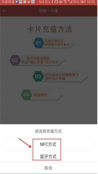 2、选择充值方式,有"NFC方式"和"蓝牙方式"两种,"NFC方式"只需要将一卡通放在手机背面即可,"蓝牙方式"主要是针对手环充值;