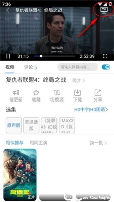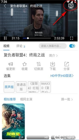 2、比如我想看复仇者联盟4,点击视频进入播放页面,点击右上角的【TV】