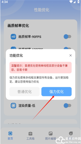 2、选择功能优化时,有普通优化和强力优化,强力优化使用多线程且兼容所有设备。
