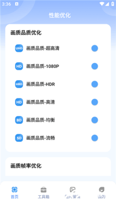 1、打开软件后,会提供画质帧率优化、渲染优化等多项设置。