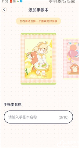 2、左右滑动选择一个喜欢的封面,并且输入手账本名称。