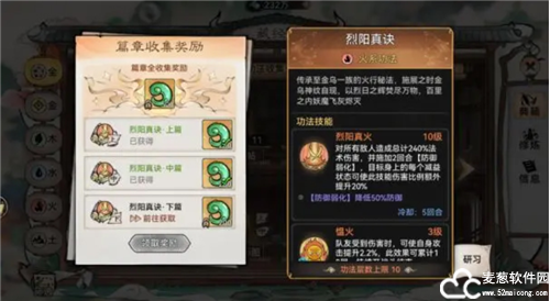 如:《烈阳真诀》为橙色功法,如只收集到中篇的《烈阳真诀》,那弟子仅能将《烈阳真诀》修炼至5层,如只收集到上、中2篇《烈阳真诀》,那弟子仅能将《烈阳真诀》修炼至10层。