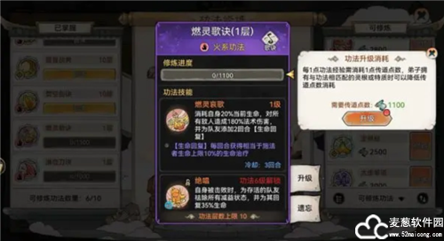 功法的修炼和升级需要消耗一定的传道点数。功法升级可以通过弟子战斗来提升,也可以直接通过消耗传道点数来进行升级。功法等级越高,所需要消耗的传道点数越多。