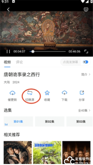2、比如我正在追唐朝诡事录之西行,打开如果播放不了的话,点击【切换源】