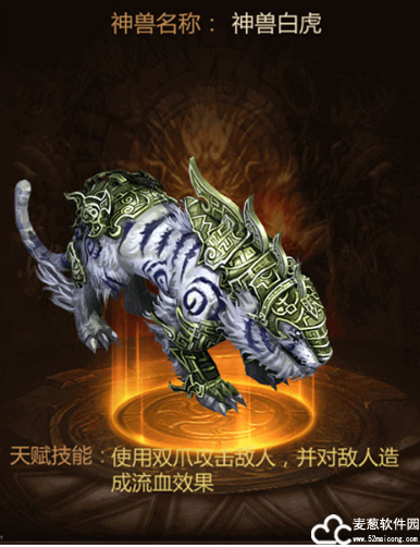而神兽白虎是来自远古的生物,战斗力十分彪悍,直接通过利爪攻击目标,可以撕咬和扑杀打击对手,让敌人处于流血状态后,状态直接减弱。这些神兽不仅战斗力惊人,外观也是十分炫酷哦。