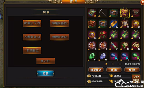 玩家可在比奇城安全区装备回收处,打开物品回收界面。在平常打怪升级当中,不需要的装备可以通过回收功能转化为海量经验、金币,高等级的装备进行回收之后还可获得大量珍贵的血符碎片,用来提升血符等级。成为VIP之后打开背包能直接使用VIP回收功能!在高等级情况下,打怪等获得经验途径效率降低,装备回收成为重要的经验来源,所以平常打BOSS获得的多余装备一定不要扔,在装备回收员出回收,可以获得大量的奖励!